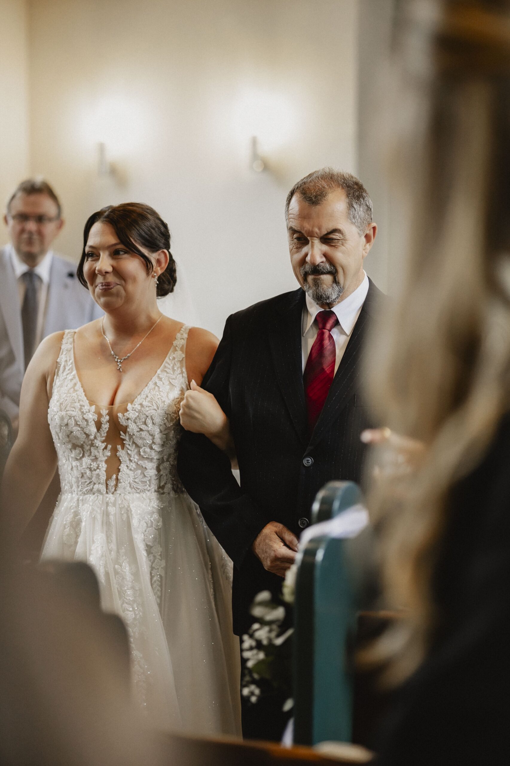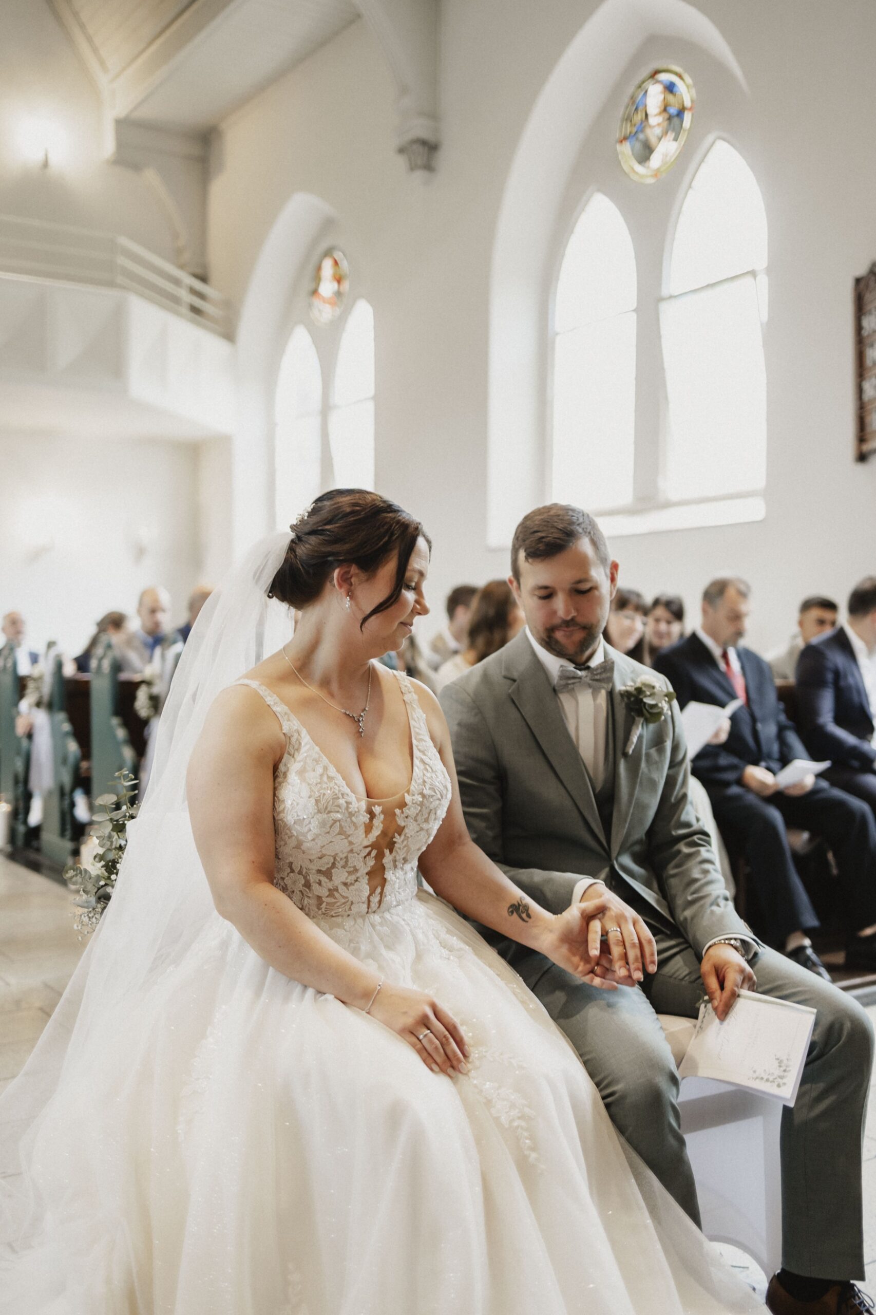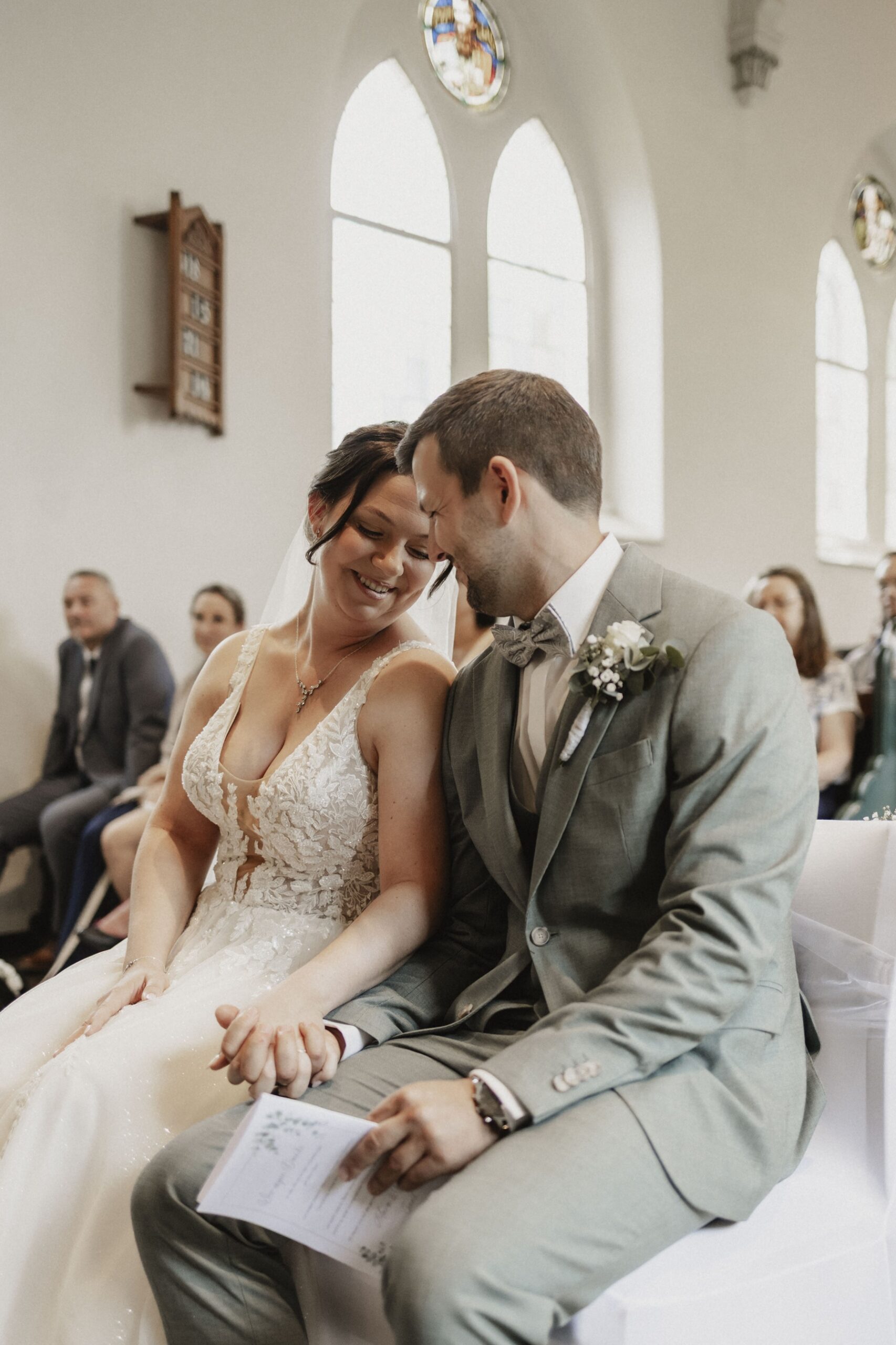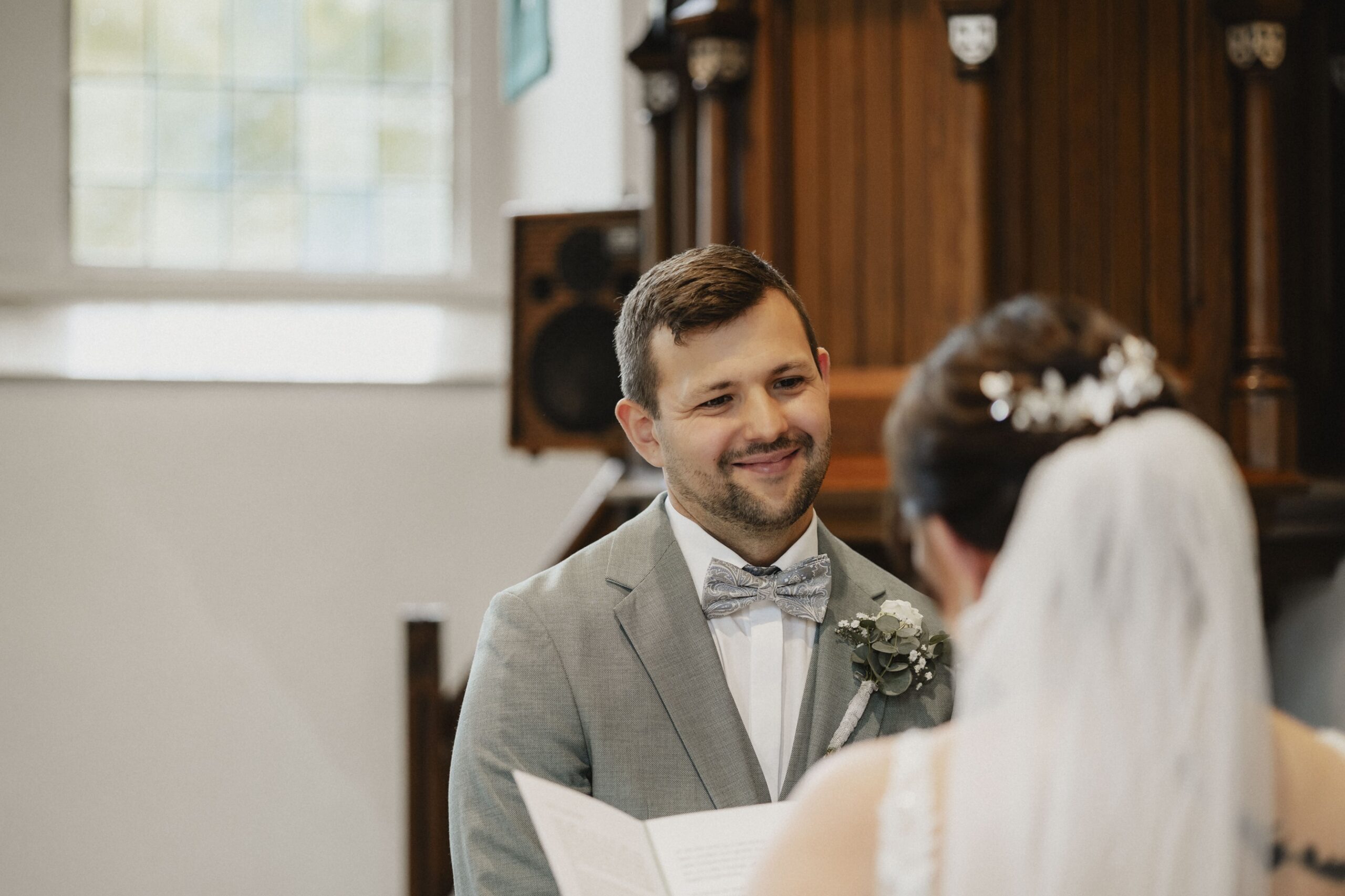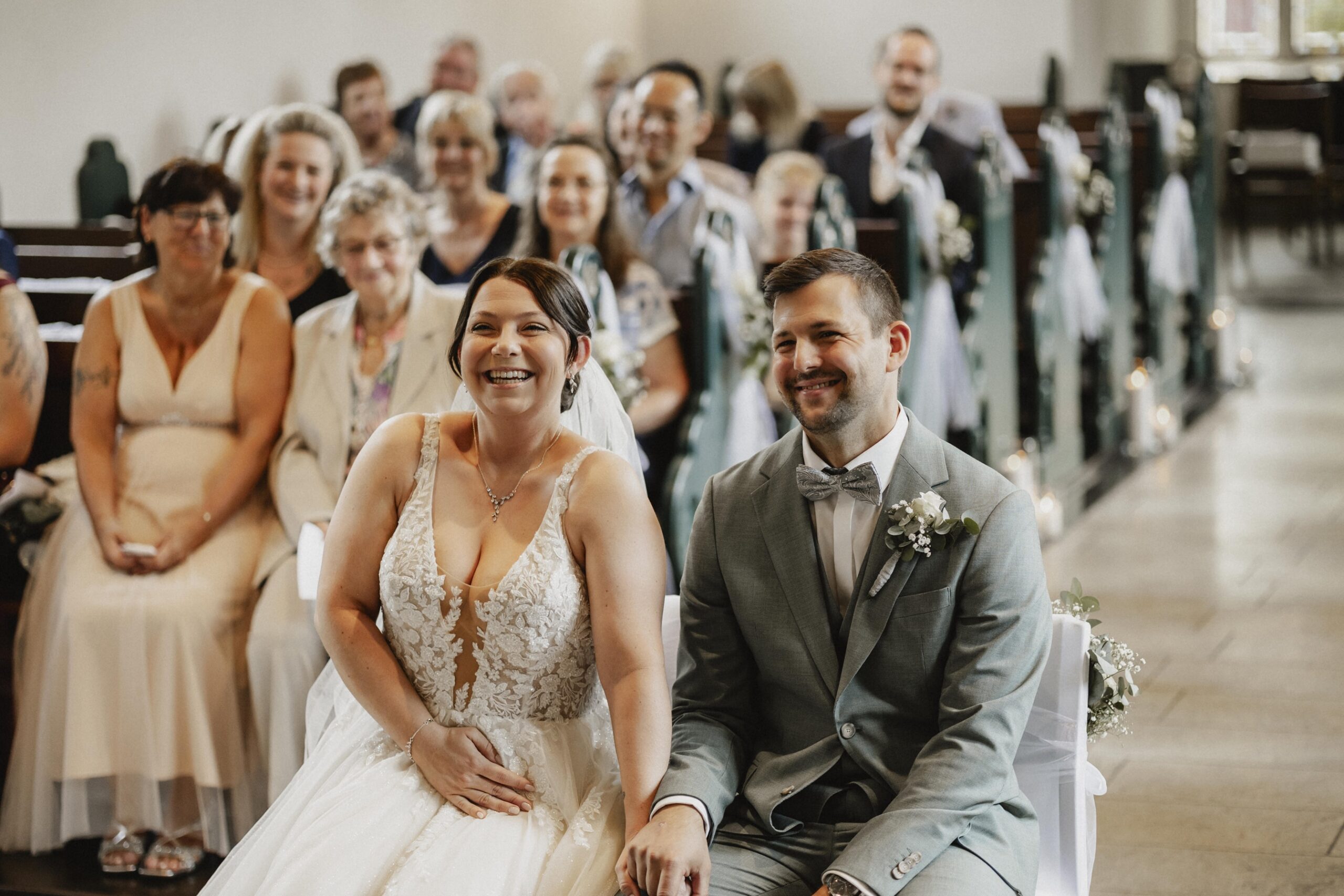Die kirchliche Trauung war geprägt von viel Lachen, berührenden Momenten und ehrlichen Freudentränen. Gerade bei kirchlichen Hochzeiten, wenn das Brautpaar mit dem Rücken zu den Gästen sitzt, wird mir immer wieder bewusst, welch großes Privileg meine Arbeit ist. Neben dem Geistlichen bin ich einer der wenigen Menschen, die die Reaktionen der beiden sehen und für immer festhalten dürfen.