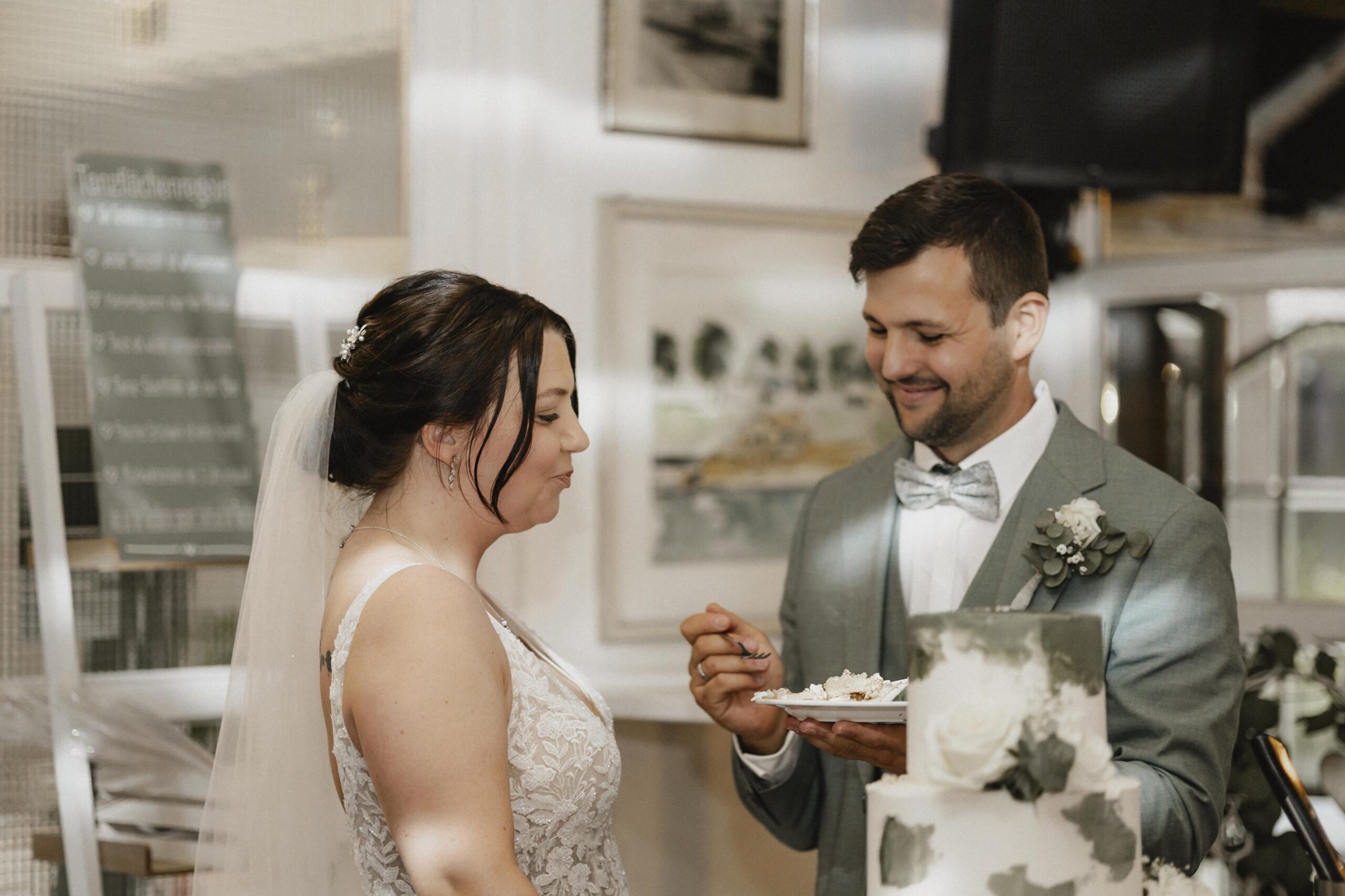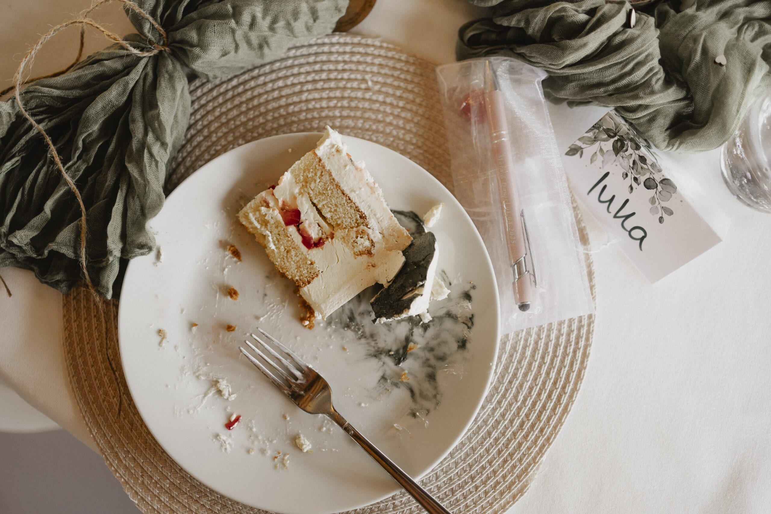 Die beiden hatten eine wunderschöne Hochzeitstorte, die perfekt zu ihrem grünen Farbmotto passte. Als alle Gäste mit einem Stück der leckeren Torte versorgt waren und zufrieden an ihren Plätzen saßen, habe ich die Gunst der Stunde genutzt und mir ebenfalls ein Stück schmecken lassen.