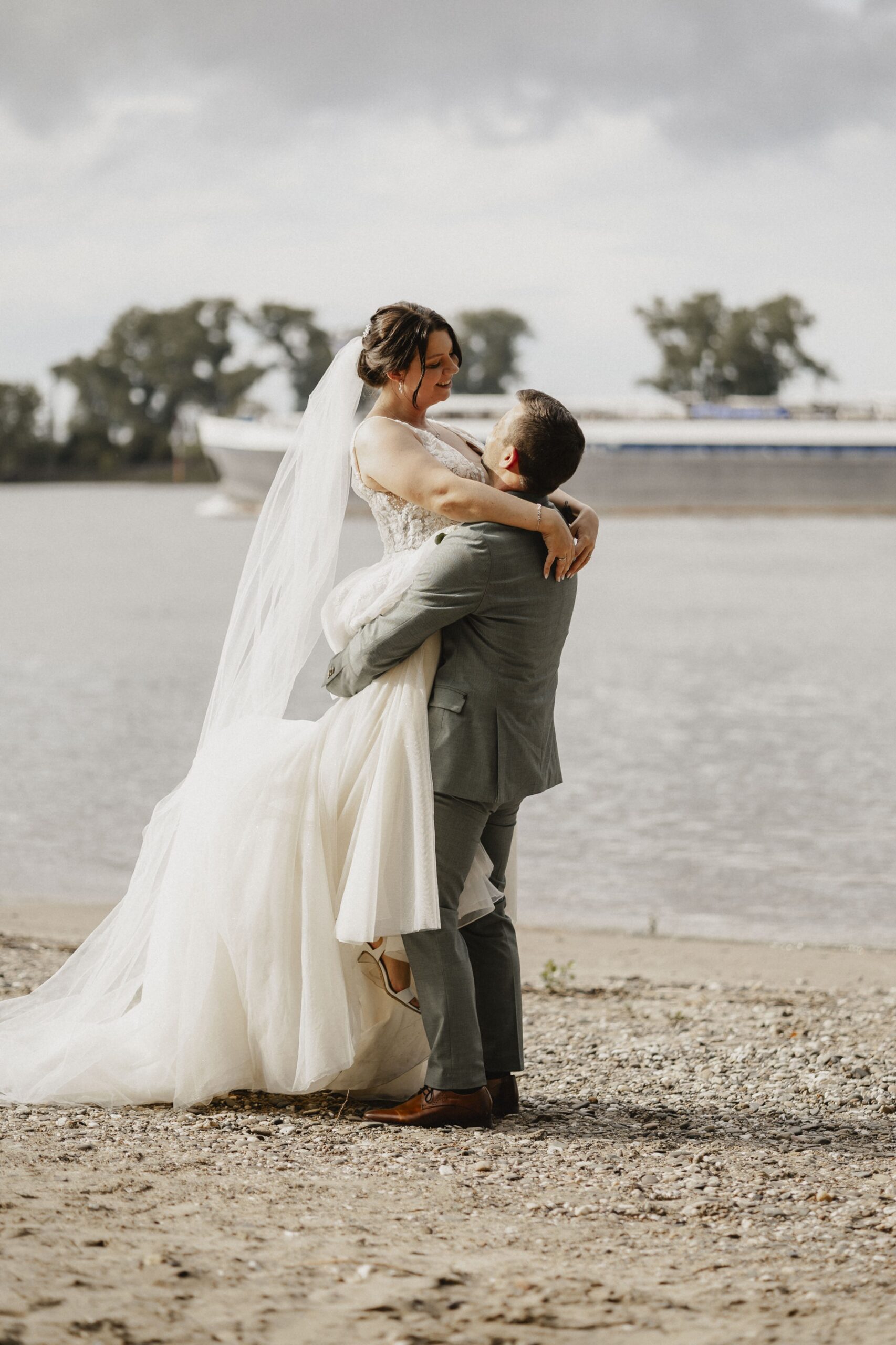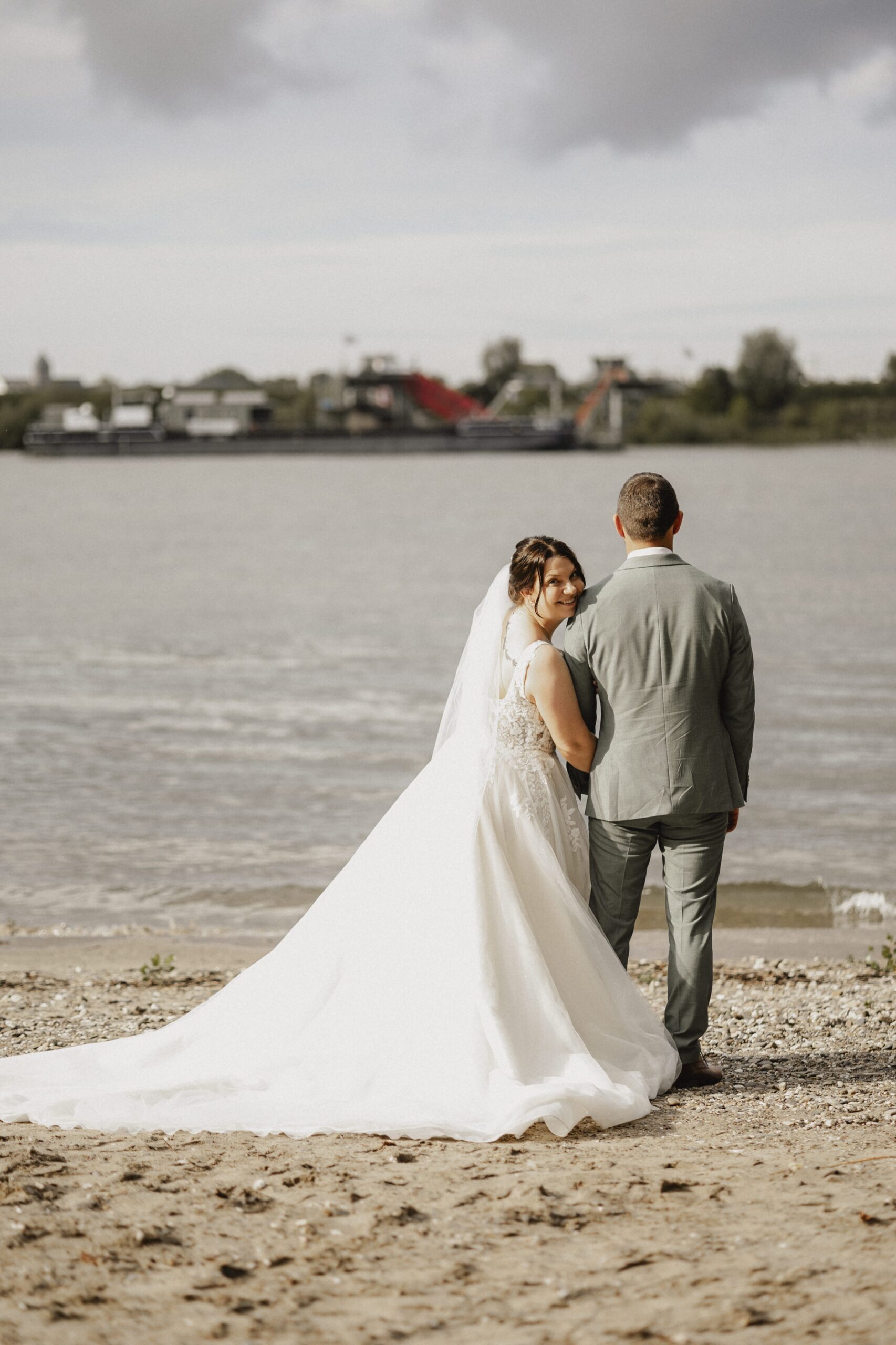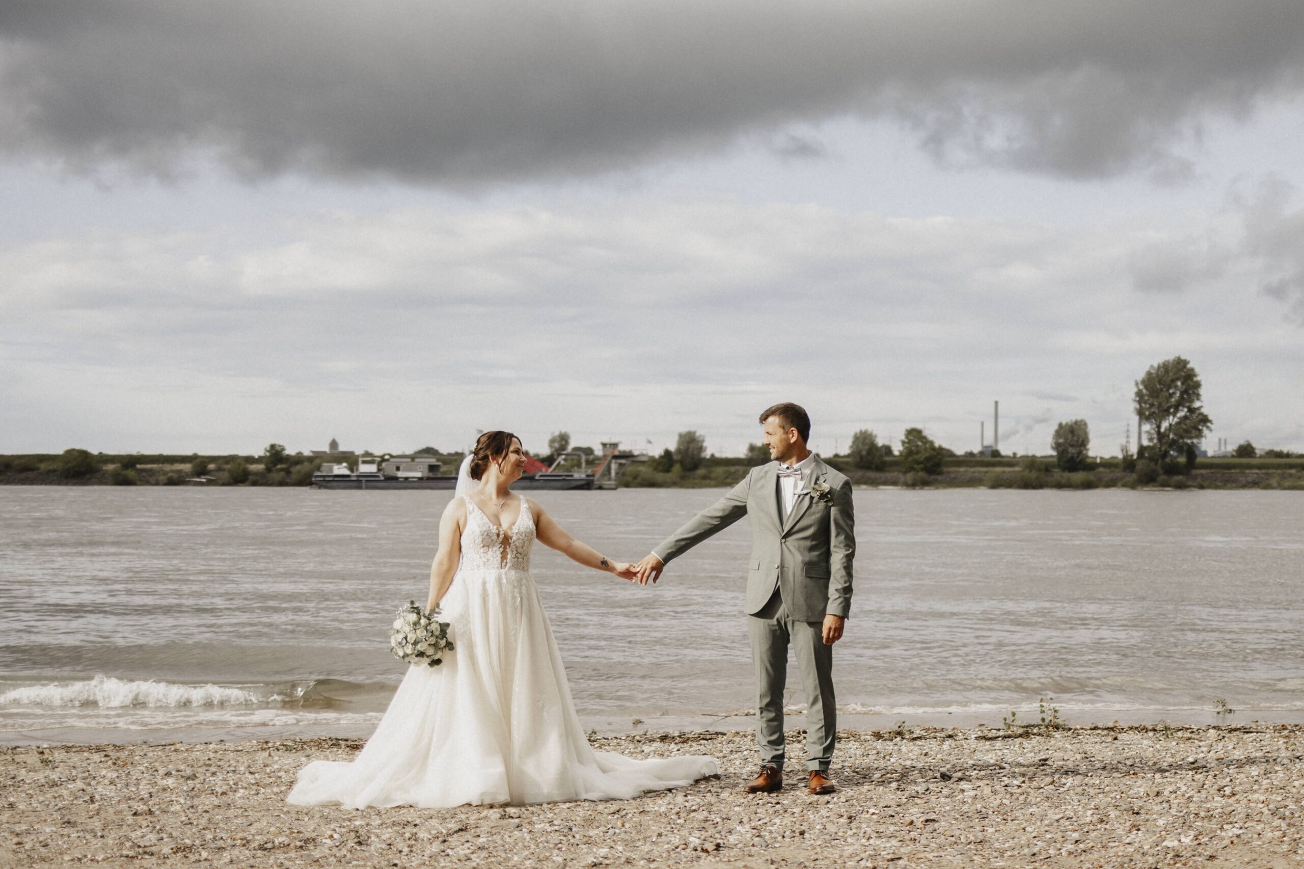Anschließend machten wir uns auf den Weg zur Hochzeitslocation, dem Achterdeck in Krefeld. Direkt am Rhein gelegen und mit einem kleinen Strandabschnitt bietet das Achterdeck Krefeld eine traumhafte Kulisse für eine moderne Hochzeit am Wasser.