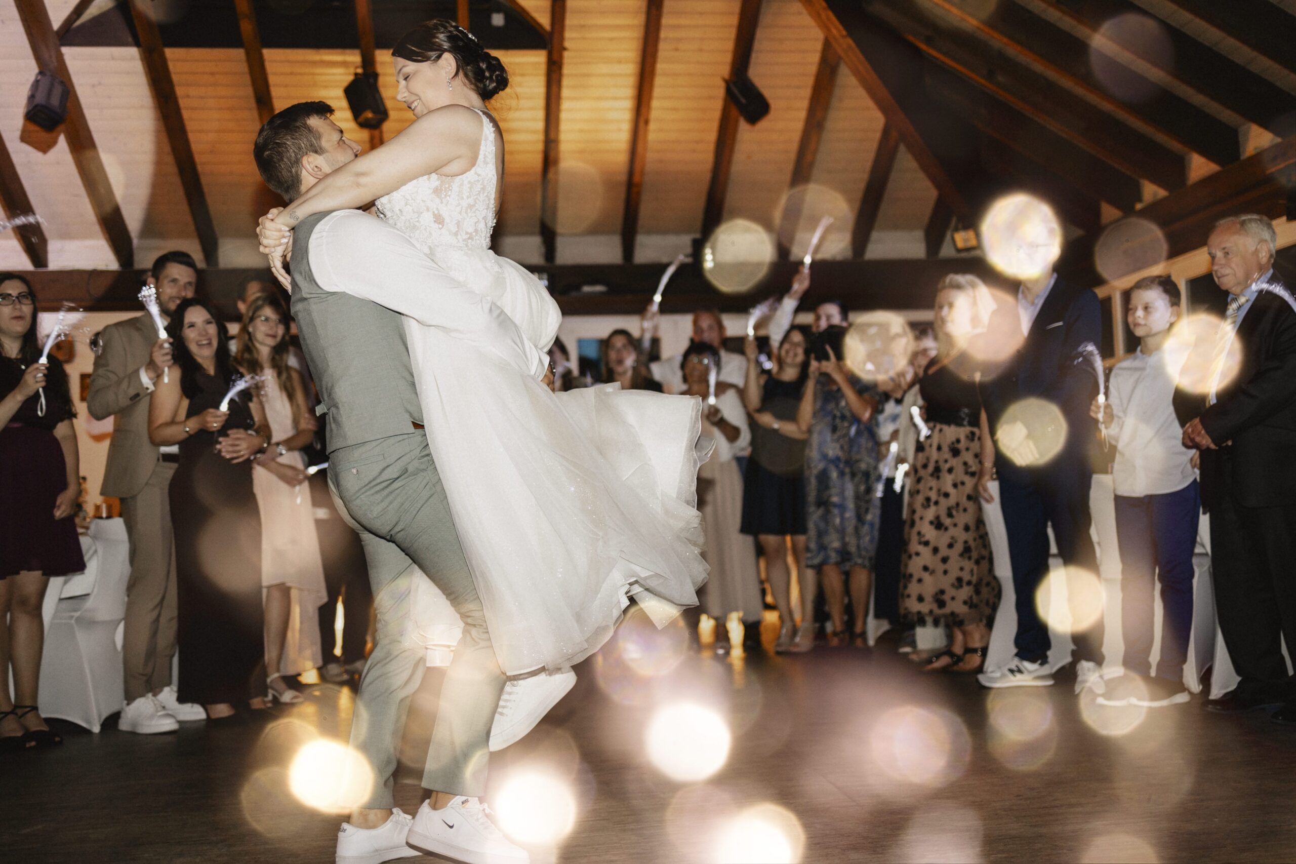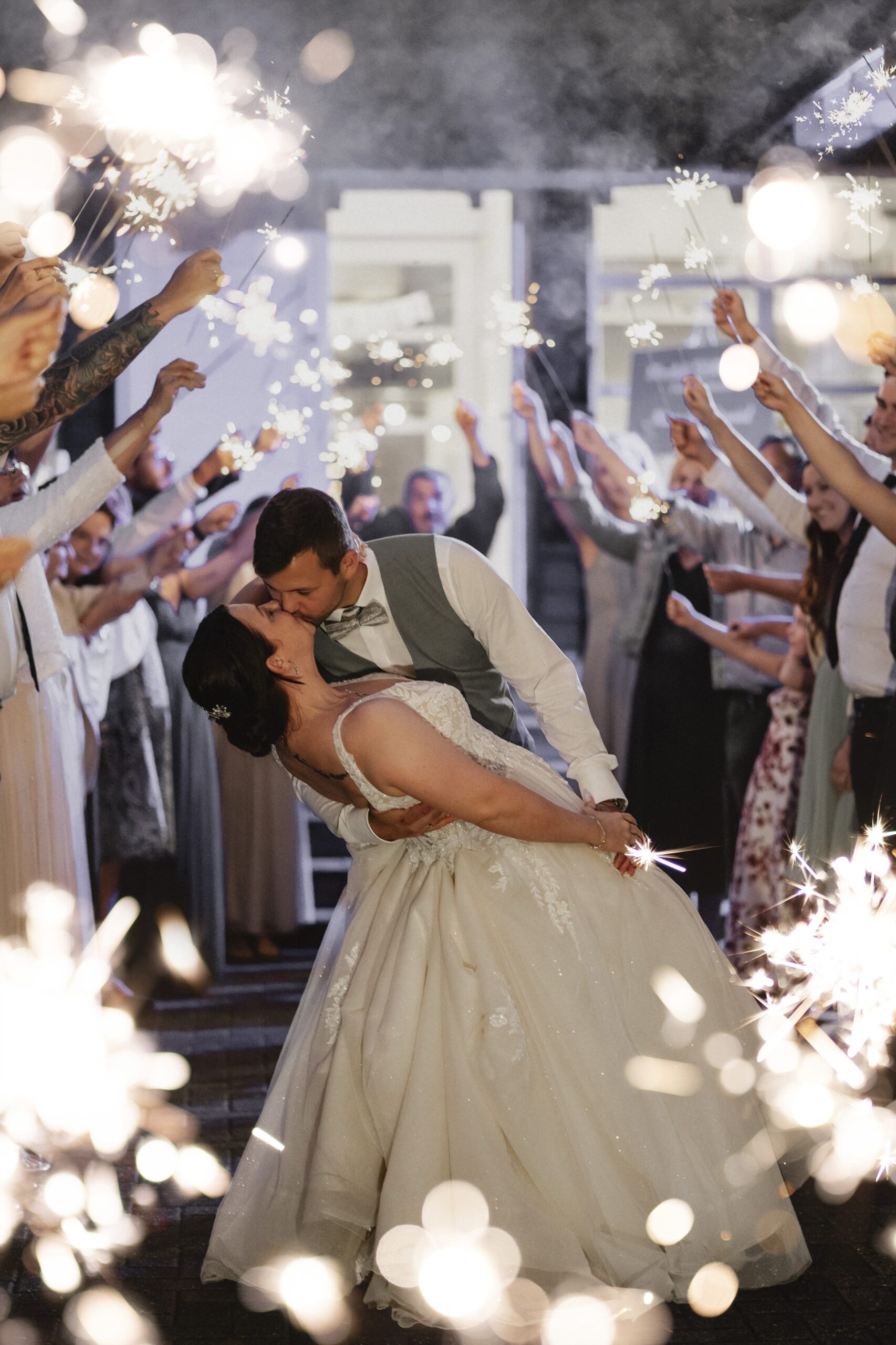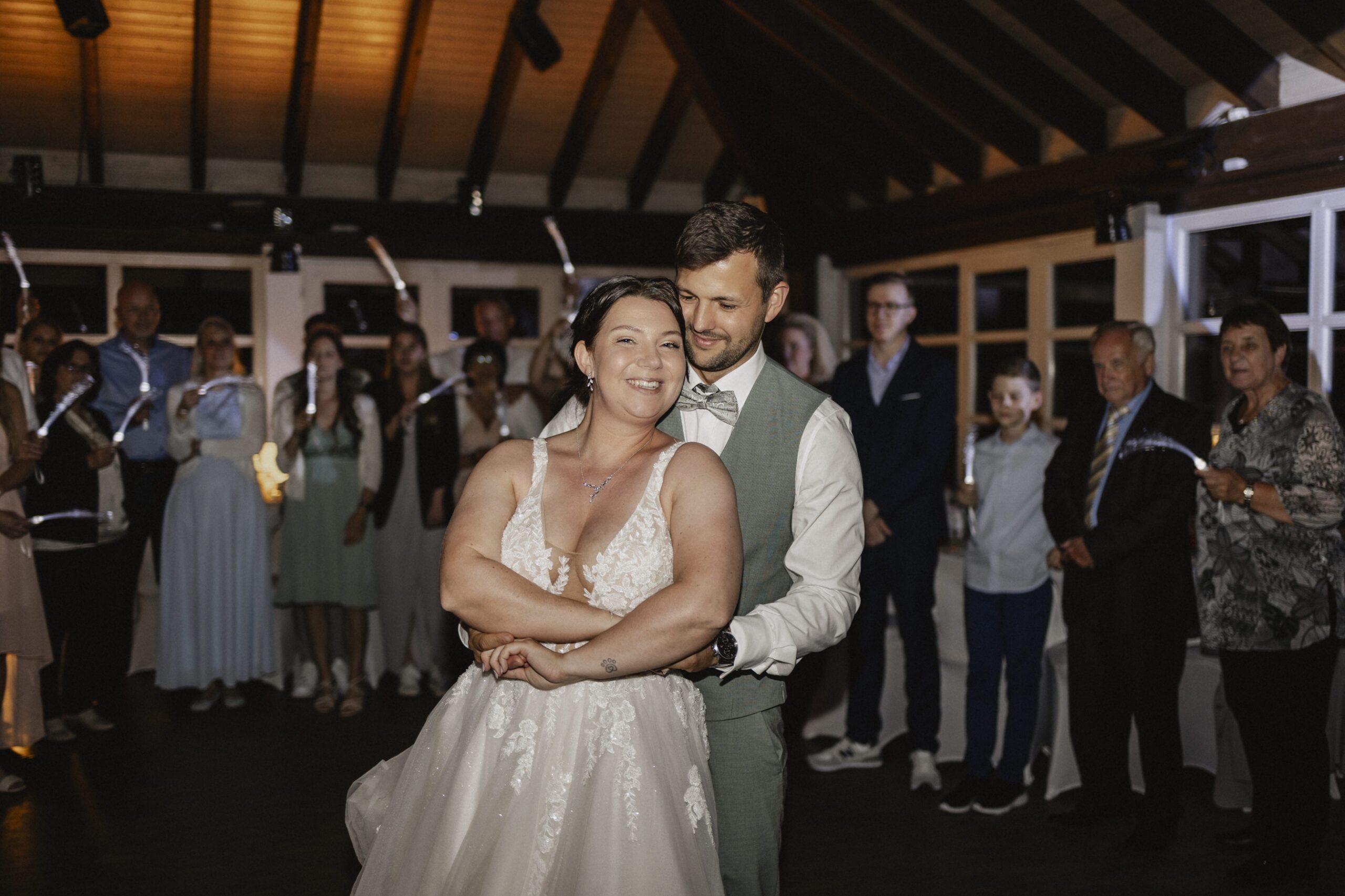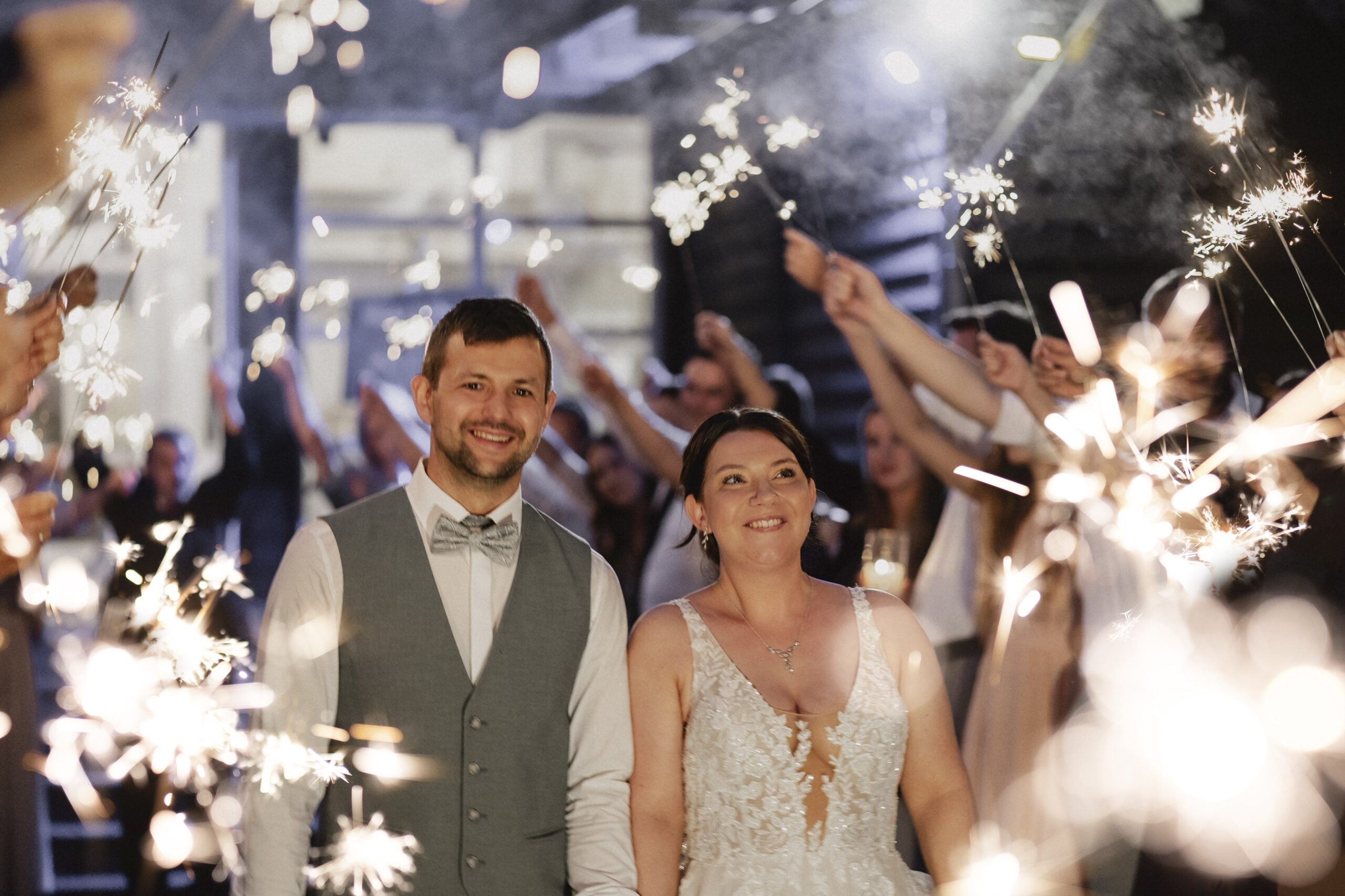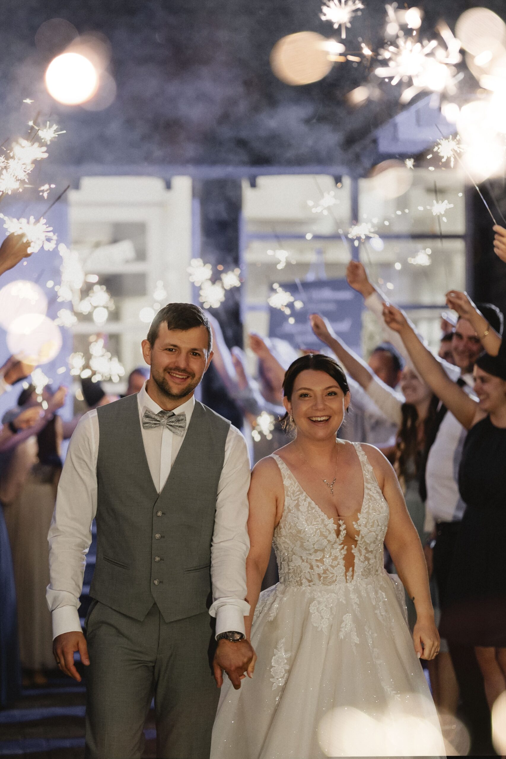 Mara und Daniel hatten sich einen Sparkling Exit mit Wunderkerzen gewünscht. Durch unsere gute Vorbereitung konnten wir diesen Moment perfekt umsetzen. Die beiden hatten extra Wunderkerzen mit langer Brenndauer besorgt, sodass wir sogar zwei Durchgänge durch das leuchtende Spalier fotografieren konnten.